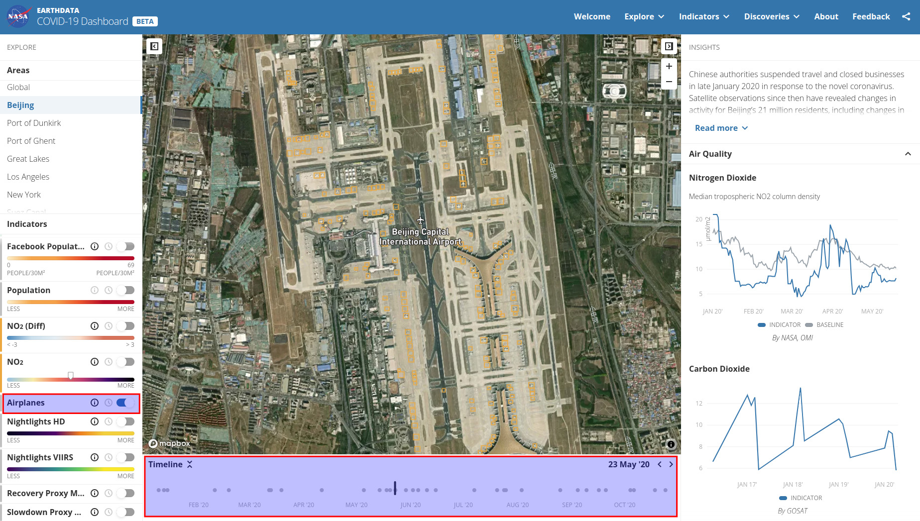 The NASA COVID Dashboard at Beijing Capital International Airport showcases daily detection of grounded airplanes in PlanetScope imagery, highlighted in orange.